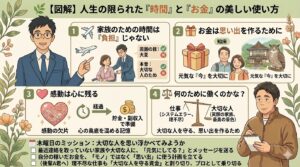 おはよう、後輩A君。 木曜日だね。毎日現場で忙しくしている君に、今日は仕事のテクニックではなくて、人生という限られた時間とお金の使い方について、少し話してみようか。