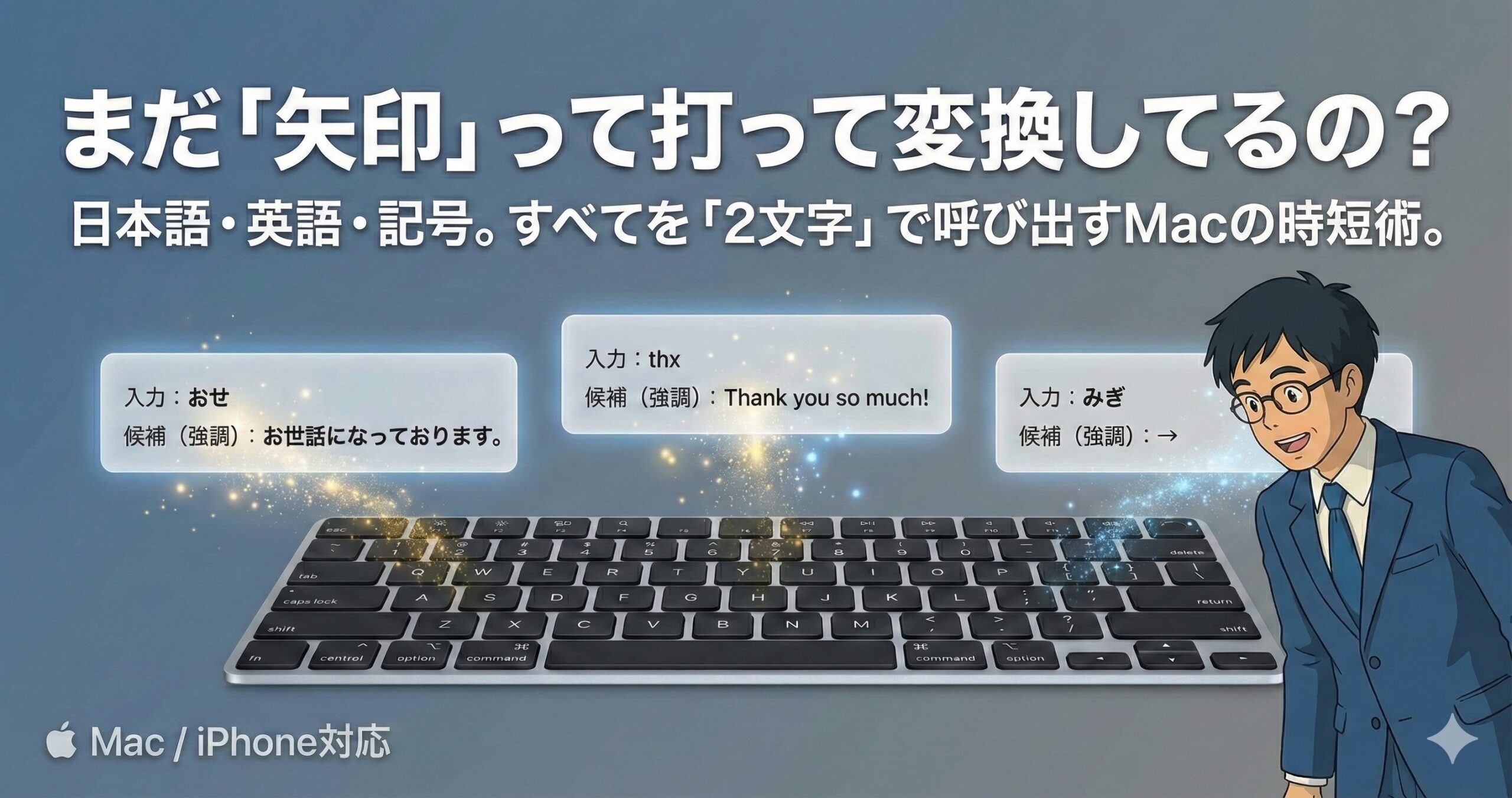 その心意気は素晴らしいよ。 でもね、毎回「お世話になっております」って打つのに3秒かかっているとしたら、1日20通メールを送る君は、毎日1分、年間で4時間以上も「挨拶を入力するためだけ」に時間を使っていることになるんだ。