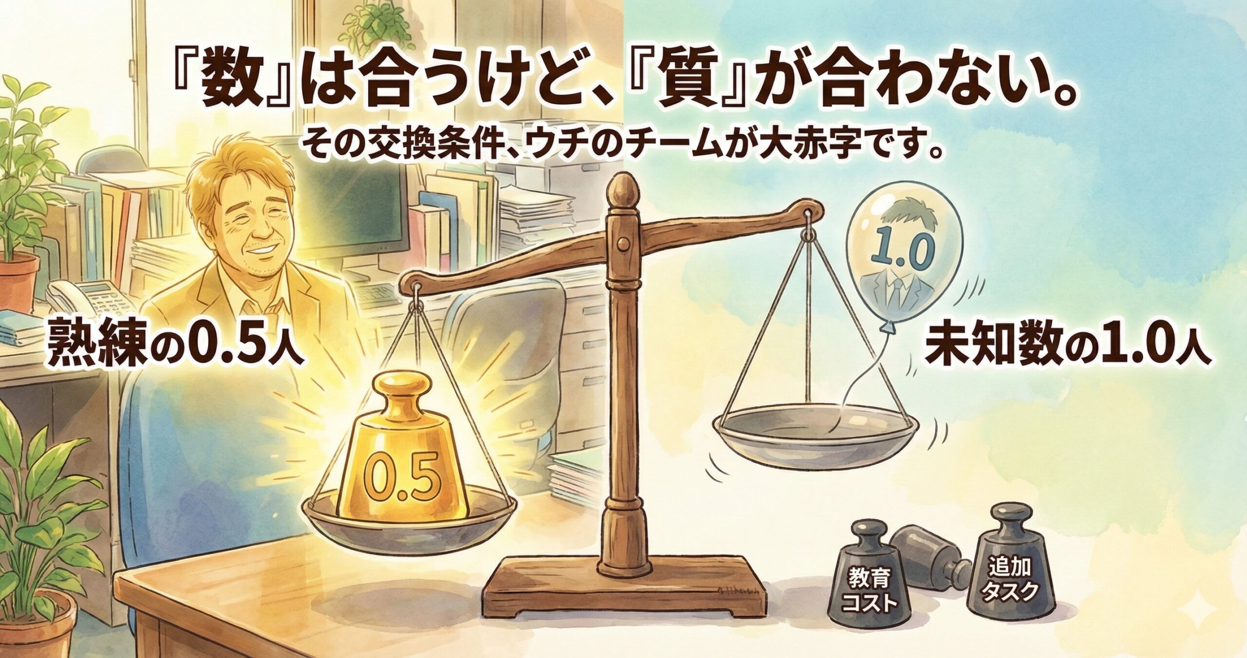 つまり、「1人増える」んじゃない。「教育係という負荷が増える」んだよ。 差し引きで言えば、チームの戦力はマイナスになる。これが現実だ。