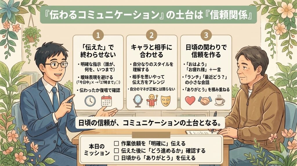 伝え方を工夫することも大事だけど、それだけじゃ足りないんだよね。相手を思って伝える、伝わったかを確認する、そして日頃の関わりから信頼関係を作っていく。その積み重ねが、「伝わるコミュニケーション」を作っていくんだよ。