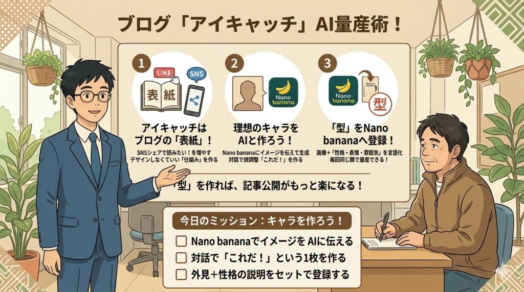 後輩A君も、まずNano bananaでキャラクターのイメージを伝えて、1枚画像を作るところから始めてみようか。「これだ!」と思える1枚が出てきたら、それがあなたのブログの顔になるんだよ。