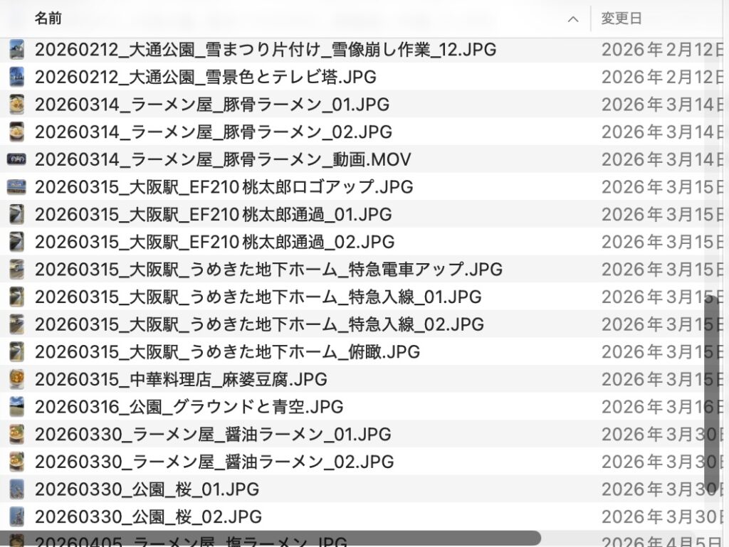 中身はバラバラ。さっぽろ雪まつりの雪像解体作業の写真が26枚あったり、ラーメン屋さんの写真が混ざってたり、珍しい電車を撮った写真もあって、「IMG_1520.JPG」って見ても何の写真かまったくわからないんだよ。