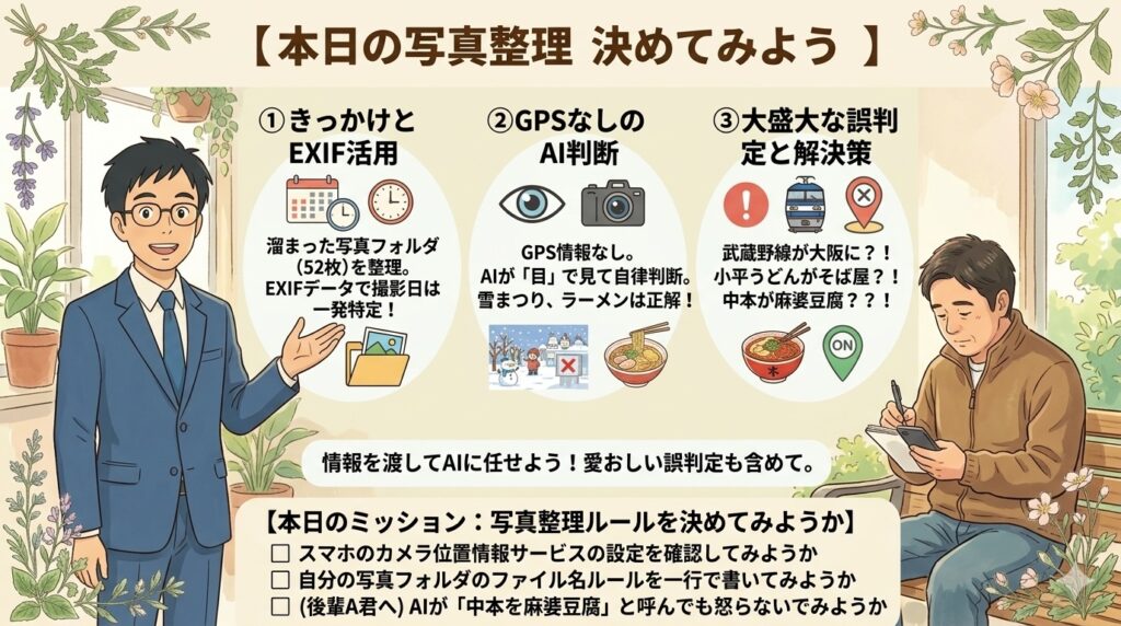 後輩A君も、まず自分の写真フォルダのルールを一行で言語化してみようか。それだけで整理の第一歩が踏み出せるんだよ。