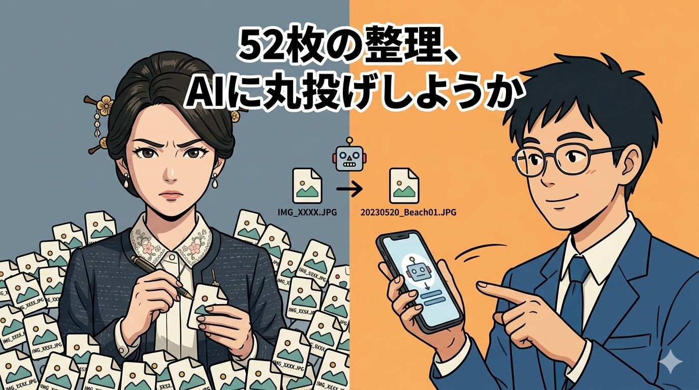 「撮影日+撮影場所+撮影内容」というルールさえ決めれば、AIが52枚を一気に見て・判断して・リネームしてくれるんだよ。