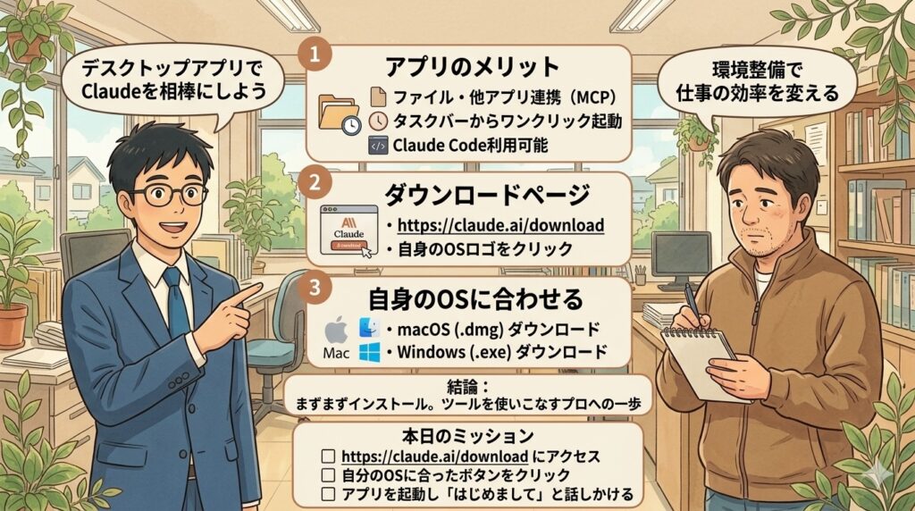 チャットだけならブラウザで十分だけれど、Claudeを「本当の相棒」として使い倒したいなら、デスクトップアプリが断然オススメなんだよ。さあ、一緒にインストールしてみようか。