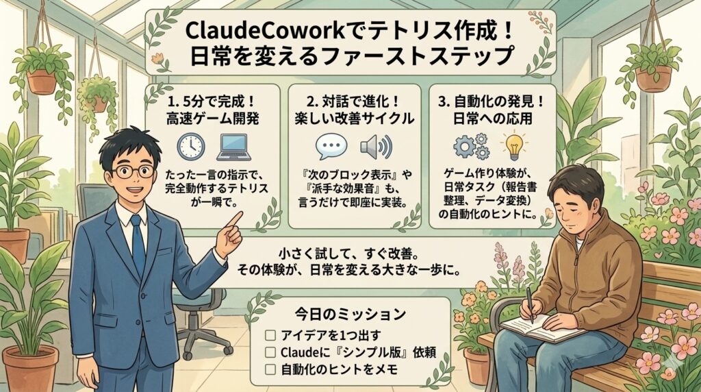 今回、ClaudeCoworkでテトリスを作ってみて、一番感じたのはね、『小さく試して、すぐ確認して、どんどん育てていける』という感覚なんだよ。5分でゲームが動いて、フィードバックを重ねてどんどん良くなっていく。この体験がね、これからの仕事の進め方を変えてくれる予感がするんだよね。後輩A君も、まずはClaudeCoworkで何か一つ作ってみてほしいんだよ。その5分が、君の日常を少しずつ変えていくファーストステップになるんだよ。一緒に、そういう体験をしていこうか。