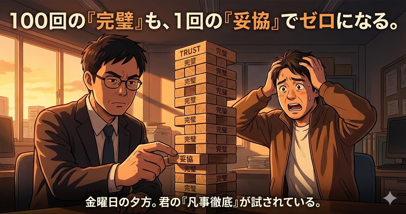 凡事徹底によって、何ヶ月も、何年もかけてコツコツと積み上げてきた「信頼という名のタワー」。 それはね、たった1回の「まあいいや」で、根元からガラガラと崩れ去ってしまうんだよ。