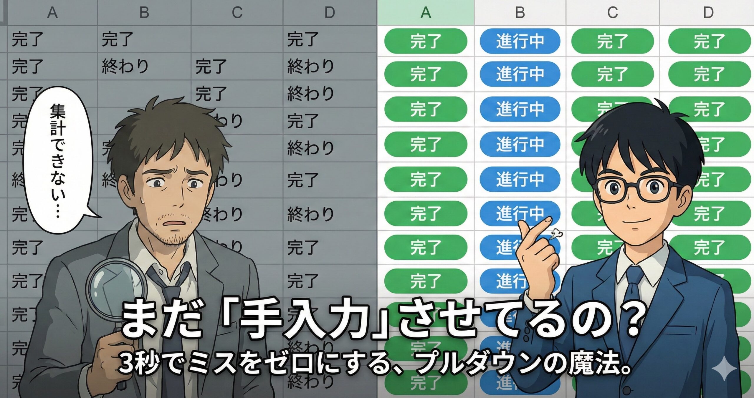これで、もう誰も「完 了」なんて謎の言葉を入力できなくなった。 君は集計ミスに悩まなくて済むし、入力する人も「いちいち『完了』って打たなくていいから楽だ!」って喜んでくれるはずだよ。