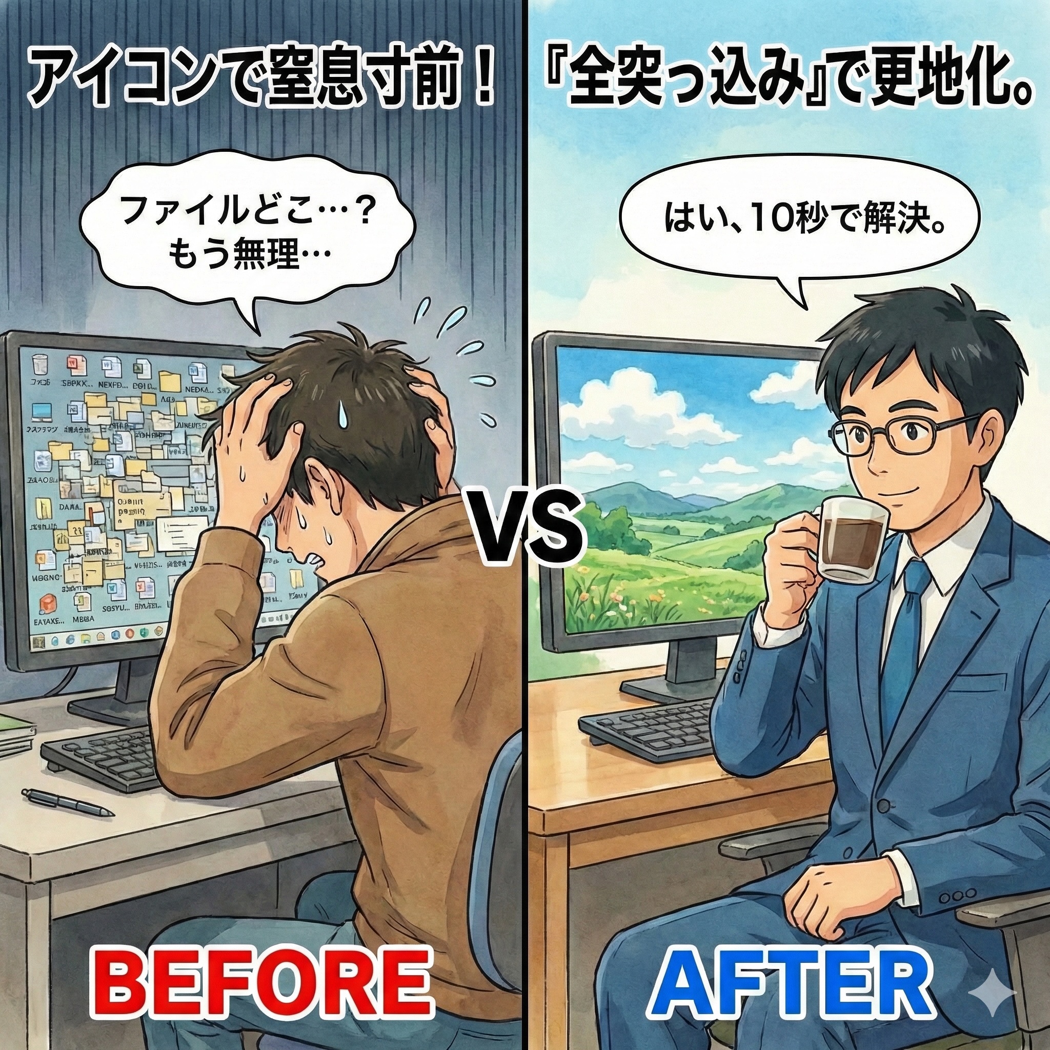 今日は、その「汚デスクトップ」を、3分で更地にする方法を教えるから、コーヒー飲み終わったらすぐにやるんだよ。