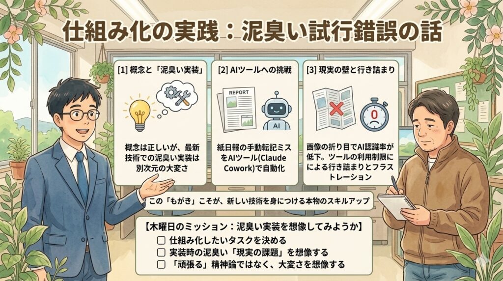 おはよう、後輩A君。 木曜日だね。以前、私は「仕組みを作ってミスを減らそう」という概念的な話をしたけれど、今日はその「実践編」で、私が昨日味わった「とても泥臭い試行錯誤」の話をしておこうか。