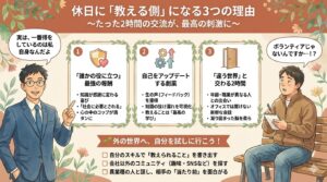 人はね、会社でお金をもらうだけじゃ、心の中のコップは満たされない生き物なんだ。 自分の持っている知識や経験が、目の前の「誰か」の役に立ち、感謝される。 その「私は社会に必要とされているんだ」という実感こそが、何にも代えがたい報酬なんだよね。