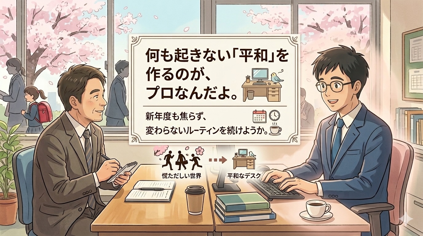 今日は、昨日の月末月初処理を通して感じた「平和な一日の価値」と、新年度のスタートダッシュで焦らないための心構えについて話してみようか。