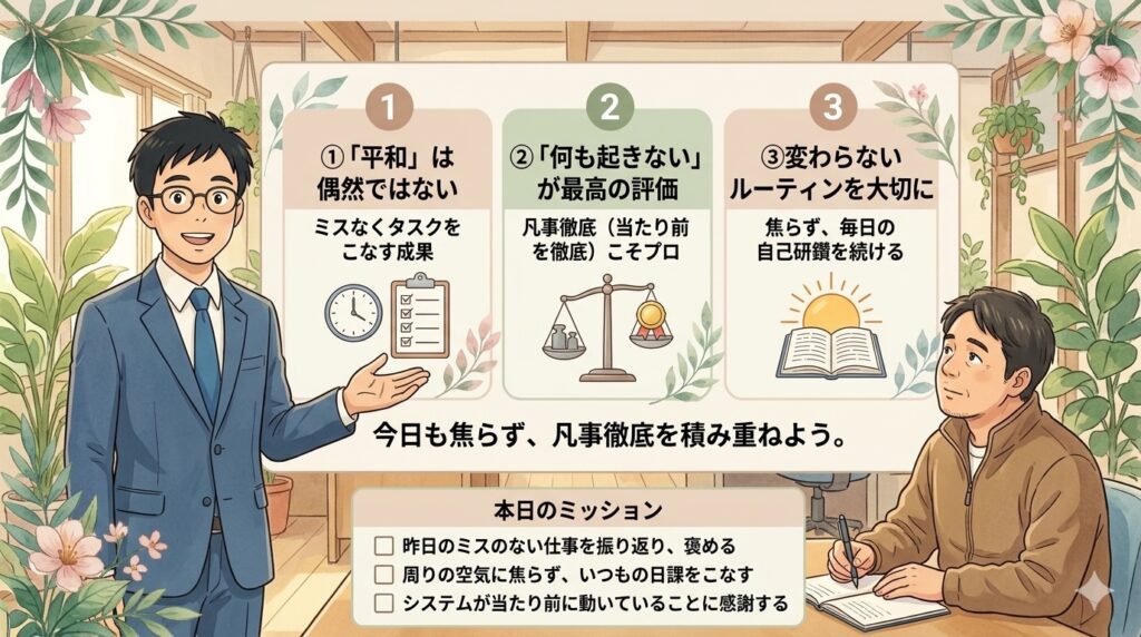 表舞台でスポットライトを浴びて「すごい新機能を作りました!」と拍手される仕事ではないかもしれない。インフラトラブルの時のように、周りから何も言われないこともあるよね。 でもね、ユーザーが「今日もいつも通りシステムが動いているな」と無意識に思える環境を守り抜くこと。この「何も起きない平和」を作り出すことこそが、プロフェッショナルとしての最高の結果なんだよ。昨日の一日は、私たちが凡事を徹底した素晴らしい成果なんだと、胸を張っていいんだからね。