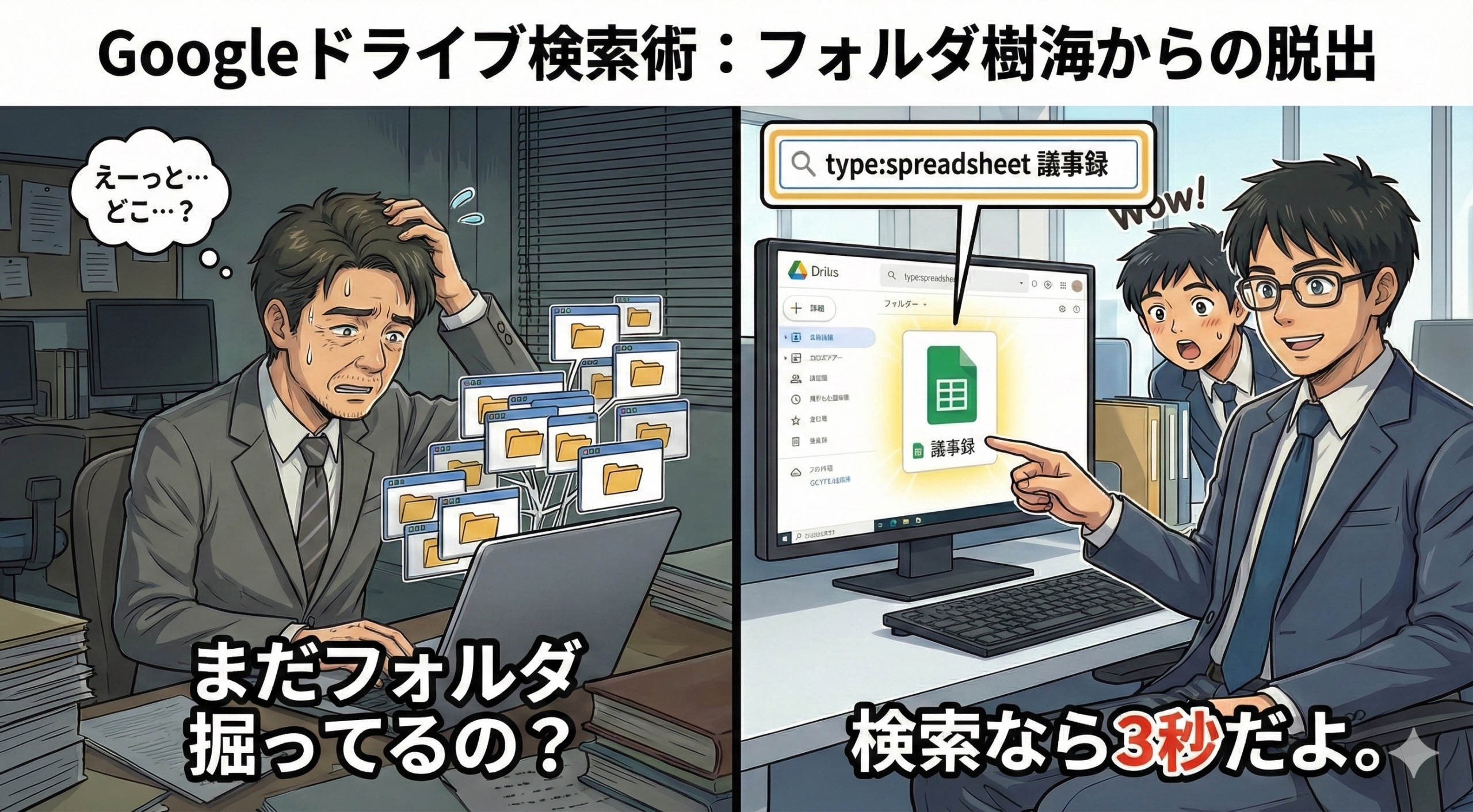 今日は、Googleドライブを使っているなら絶対に知っておくべき、「3秒でファイルを見つける検索術」を教えるね。