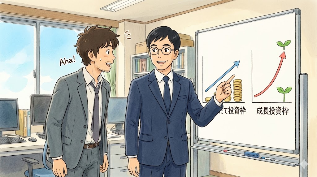 「余剰資金ができたら、迷わず成長枠へ」 これが、後輩A君の頑張りを一番効率よく「未来の自由」に変える方法なんだ。怖がらなくて大丈夫、時間は味方してくれるから。