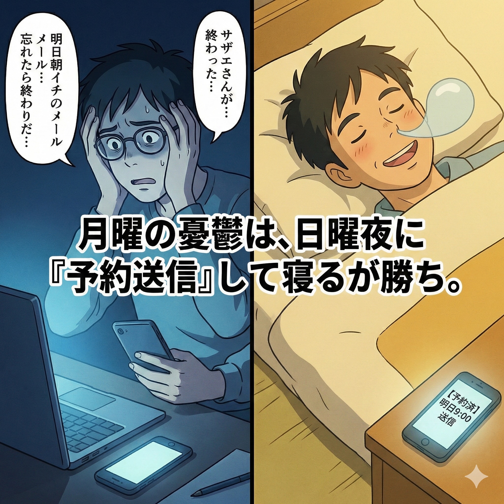 今日は、そんな君の憂鬱を吹き飛ばして、今すぐ布団に入って爆睡するための「予約送信(スケジュール送信)」の話をしよう。