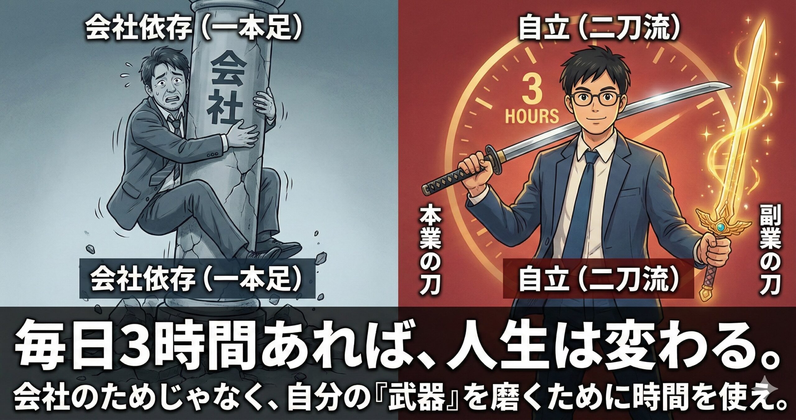君はいま、会社から支給された「正社員」という刀一本で戦っている。 もちろん、それは立派な武器だ。 でも、もしその刀が折れたら? 会社が傾いたり、君が体を壊したりしたらどうする?